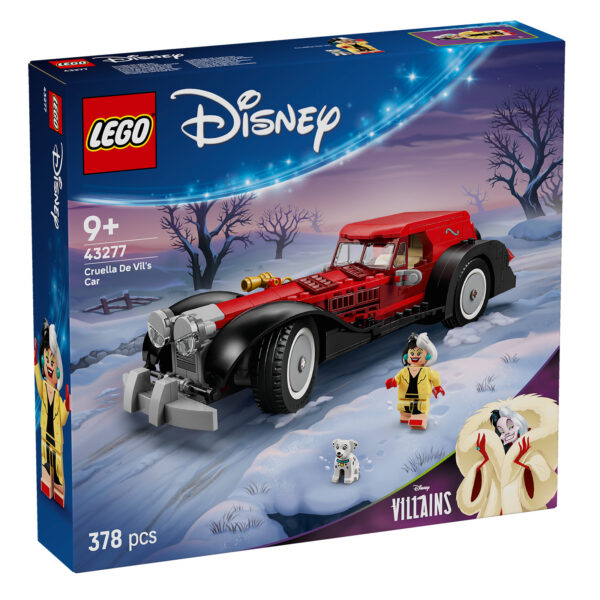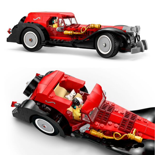 Il set LEGO 43277 Auto Crudelia De Mon è composto da 378 pezzi ed è perfetto per appassionati e collezionisti a partire dai 9 anni. Durante la costruzione, ogni passaggio diventa un viaggio nel mondo dello stile e della creatività: la carrozzeria lucida, le linee sinuose e i contrasti cromatici ricreano alla perfezione l’aspetto sofisticato e audace del veicolo. Ogni dettaglio è curato con grande attenzione, dai fari anteriori al parabrezza elegante, fino al cofano allungato che dona un tocco di classe e potenza.